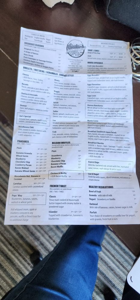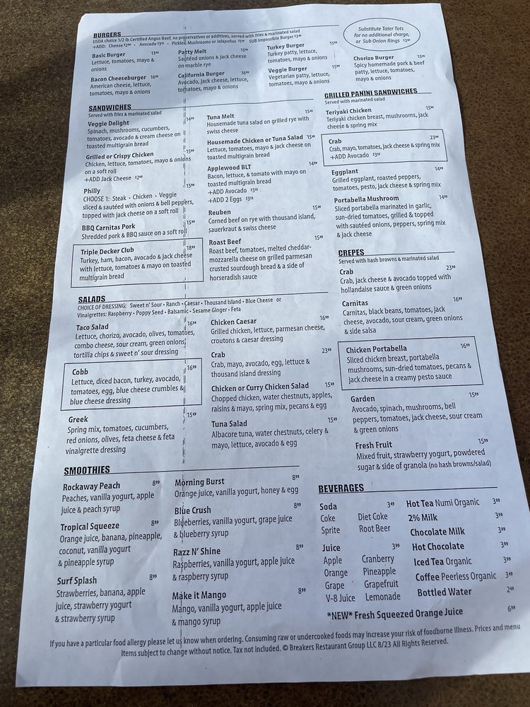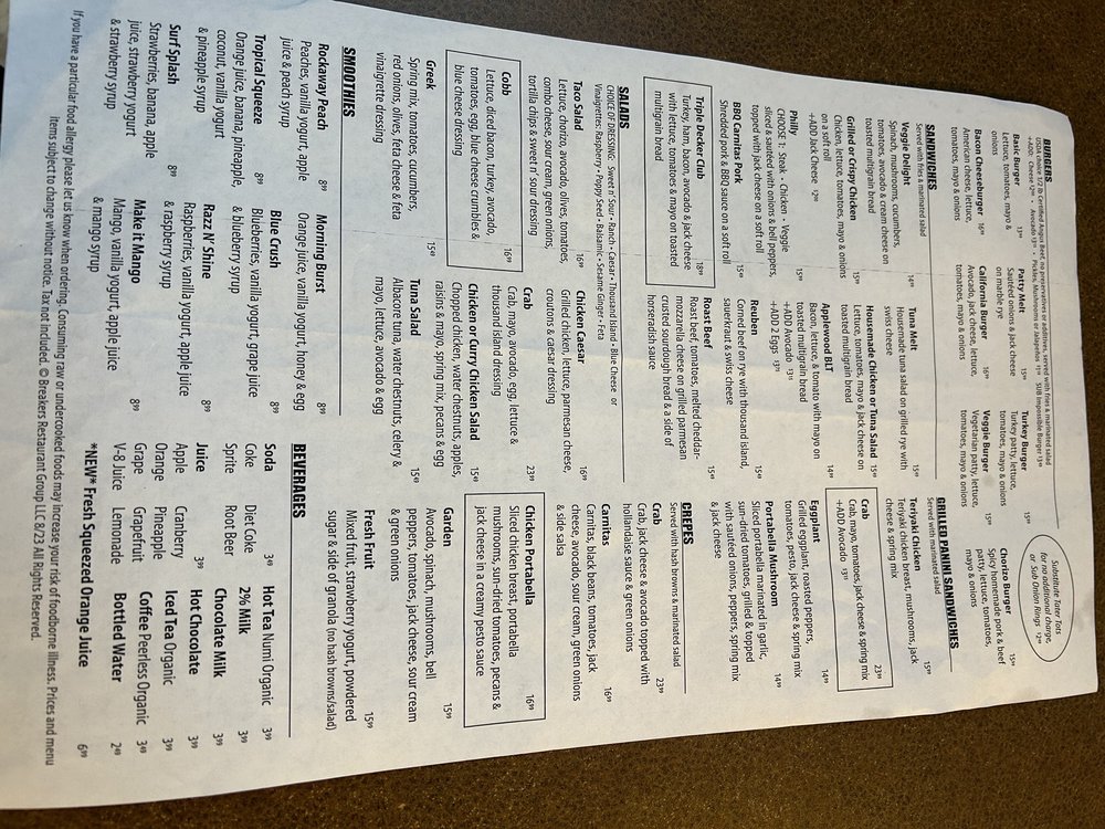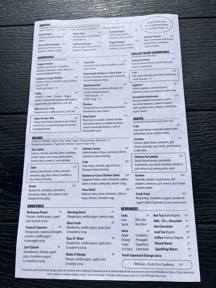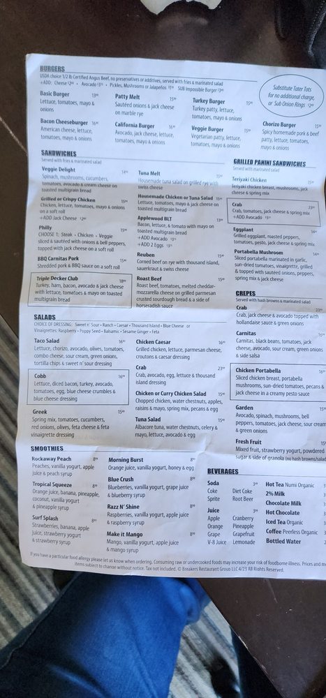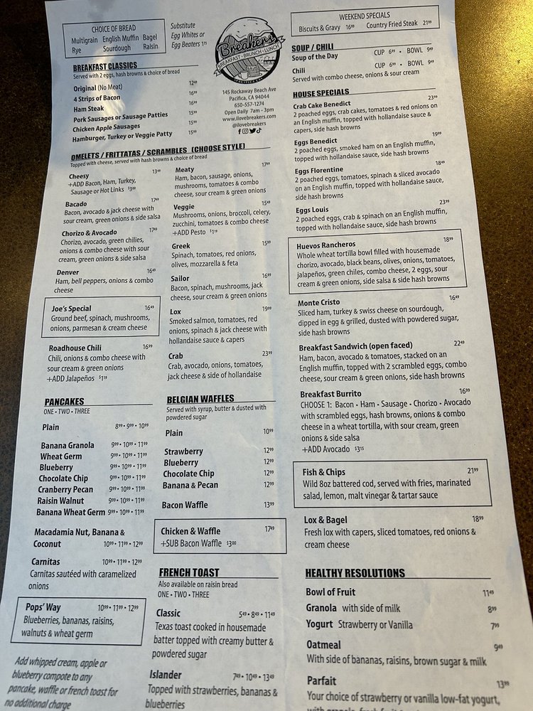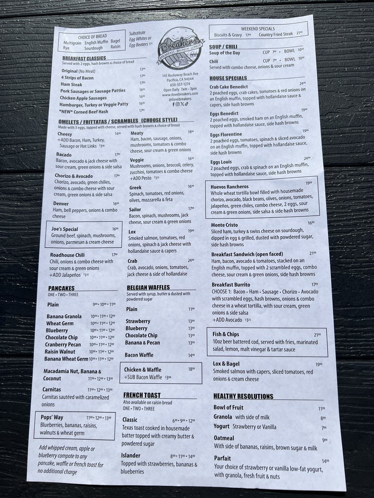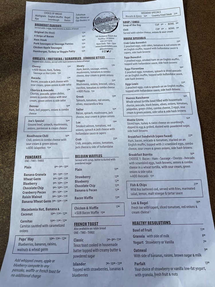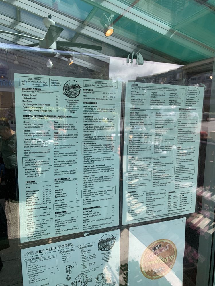 Introducing the menu at Breakers Breakfast Brunch & Lunch located in Pacifica, CA, a charming spot offering a variety of breakfast, brunch, and lunch options. The restaurant provides takeout, delivery, and vegan/vegetarian-friendly dishes. With a focus on sustainability, they offer compostable and plastic-free packaging. Customers rave about the friendly service and delicious food, such as the corned beef hash and clam chowder special. The outdoor seating with ocean views is a highlight, making it a perfect spot for a relaxing meal. The diverse menu options, quick service, and consistent quality make Breakers a must-visit for a delightful dining experience.